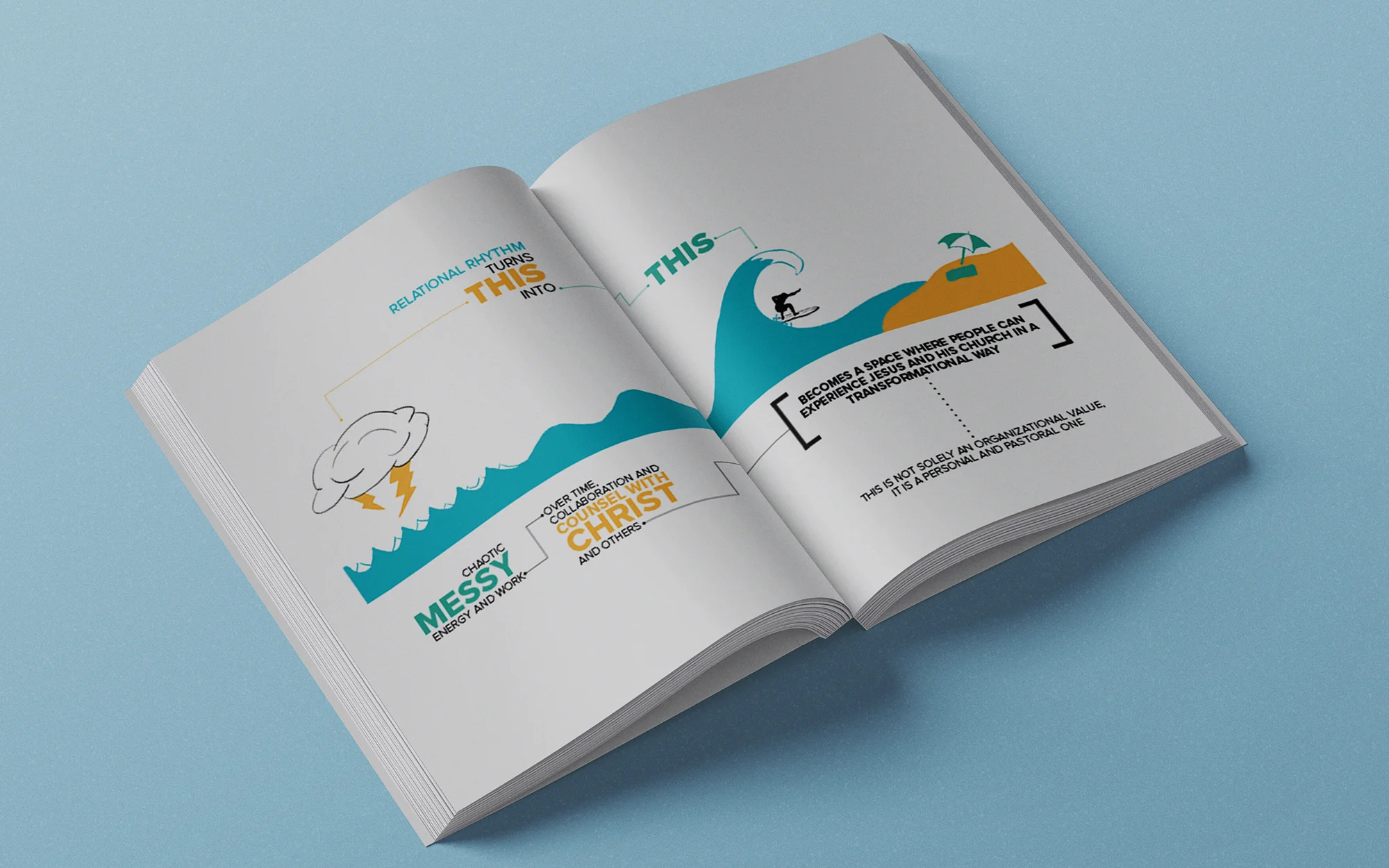 The content was divided into three parts: Relational Rhythm, Intelligent Design, and Savvy Stewardship. Each of those parts was represented by a color, and a mixture of hand drawn illustrations and digital "cell" elements try to capture the feel of an organized organism. The result is a playful and thought-provoking journey that engages the user far more than your typical section of an employee handbook.