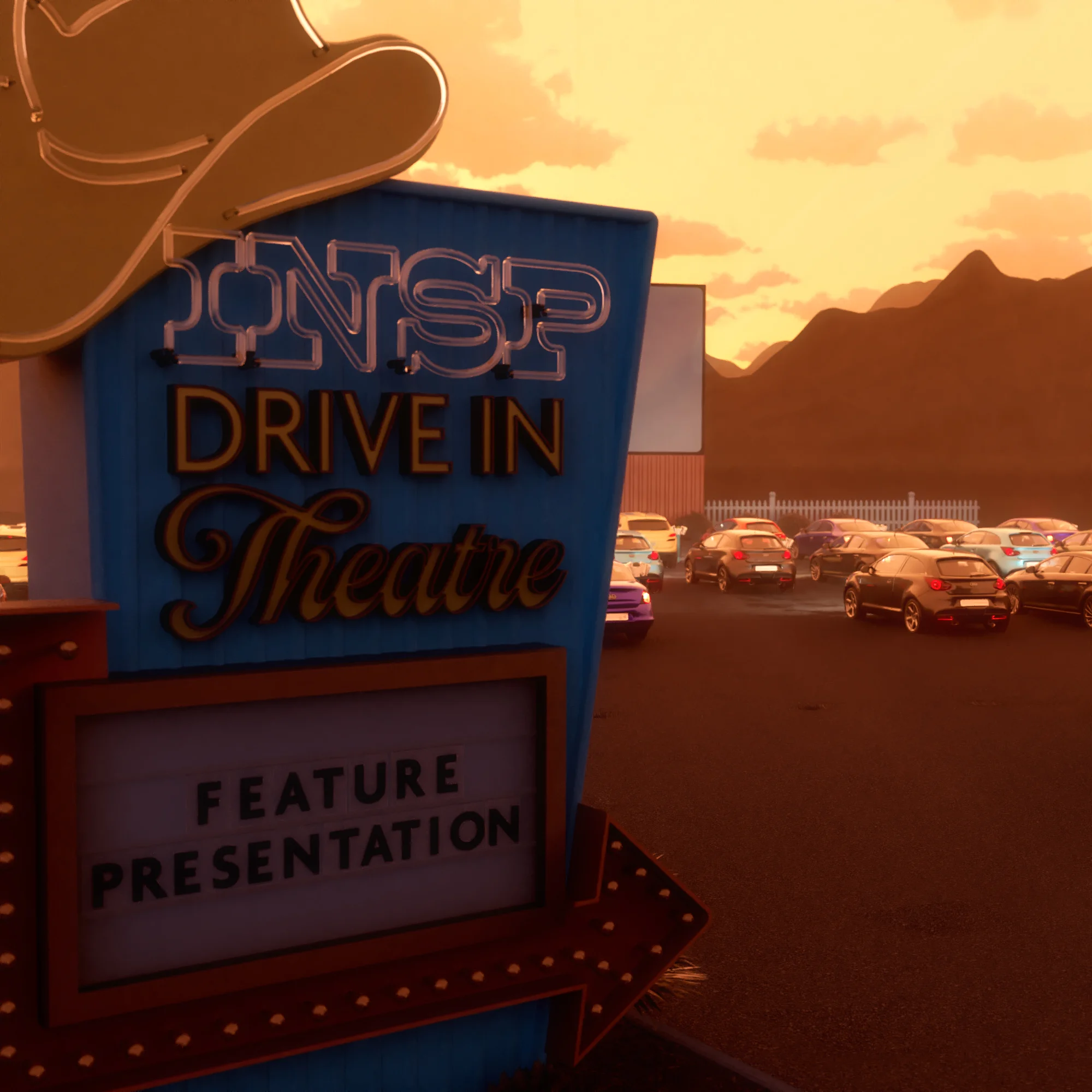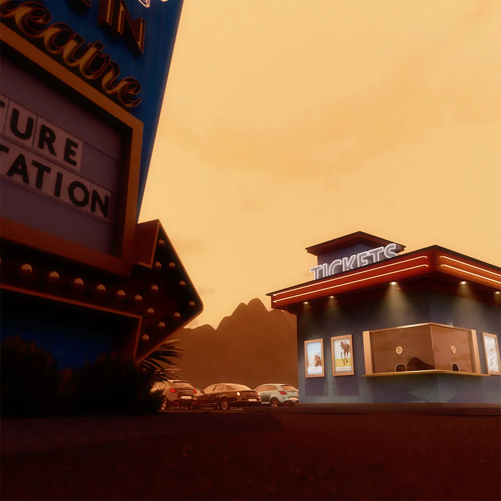 With the types of movie showing branching out past the typical cowboy westerns, we created an Americana, route-66 inspired drive-in movie theatre set in a western landscape. It's a nod to both the typical INSP programming and the brand of nostalgia their audience enjoys. The result is a slick "INSP Presents" style pre-roll that tells the user they can settle in for a spell.